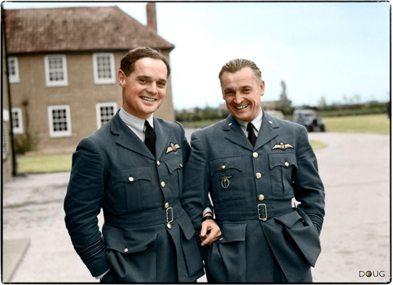 Squadron Leader Douglas Bader, commanding No. 242 (Canadian) Squadron, with Major Alexander ‘Sasha’ Hess, CO of No. 310 (Czechoslovak) Squadron, outside the Officers Mess building, Duxford, Cambridgeshire. October 1940.