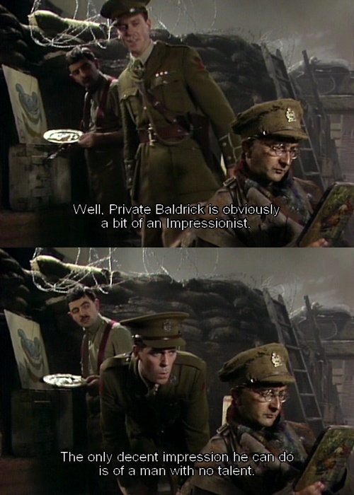The series placed the recurring characters of Blackadder, Baldrick and George in a trench in Flanders during World War I, and followed their various doomed attempts to escape from the trenches to avoid certain death under the misguided command of General Melchett.