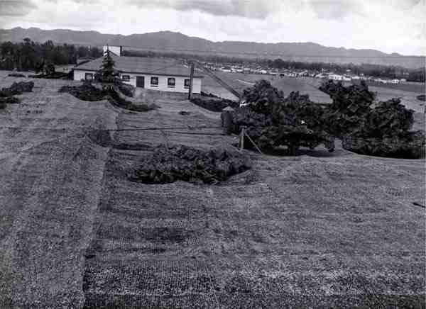 The Lockheed-Vega plant, in Burbank, was hidden completely below a complete blanket of cover. It gave the appearance of a suburban area, rubber vehicles and quaint, peaceful neighborhoods were painted on canvas. Hundreds of fake shrubs and trees were placed around the area to make the area look more three-dimensional.