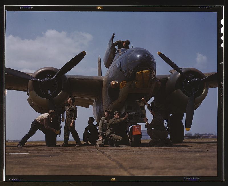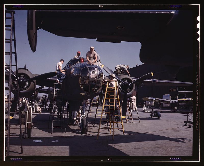 Employees on the “Sunshine” assembly line at North American’s plant put the finishing touches on another B-25 bomber, Inglewood, California. In addition to the battle-tested B-25 (“Billy Mitchell”) bomber, used in General Doolittle’s raid on Tokyo, this plant produces the P-51 (“Mustang”) fighter plane which was first brought into prominence during the British raid on Dieppe