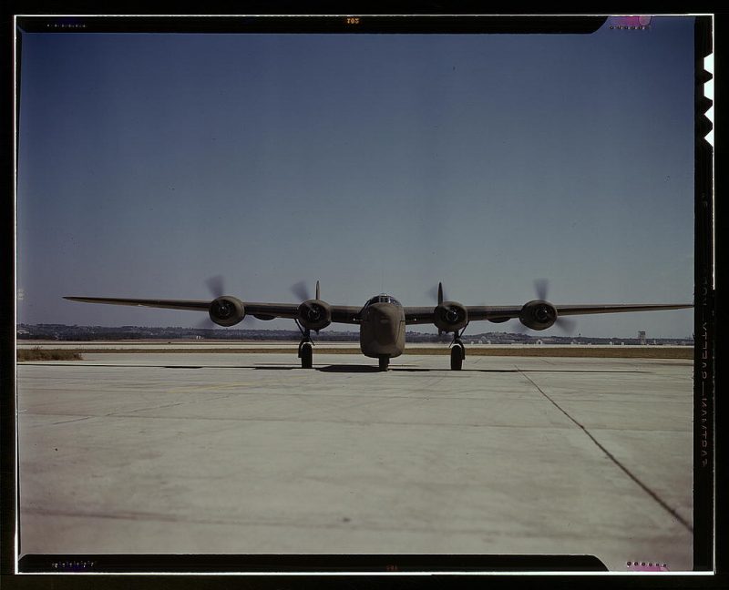 A C-87 transport plane, just off the assembly line, at the Consolidated Aircraft Corporation field, Fort Worth, Texas.