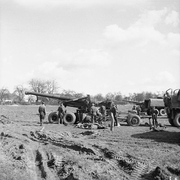 Royal Artillery 7.2-inch howitzers mounted on modified US 155 mm Long Tom carriages being brought up to provide support for the Rhine crossing [via]