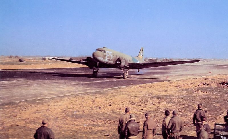32d Troop Carrier Squadron Douglas C-47A-15-DK Skytrain 42-92862 taking off from Poix Airfield (B-44), France, during Operation Varsity, 24 March 1945 [via]