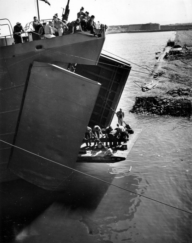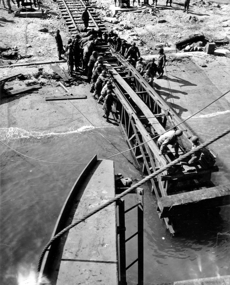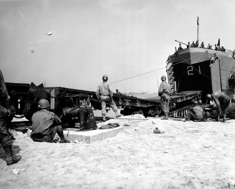 These pictures were taken on July 31st 1944 when the first Ferry Train LST (LST-21) arrives and unloads the first train.