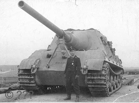 The 12.8cm gun protrudes through the front plate and is protected by a snout-like armoured mantlet. This gun was developed from an anti-aircraft gun. It fired a 28kg armour piercing projectile at 840 metres/sec and could pierce 16.7cms of steel armour inclined at 30 degrees at 1,000 metres. All Allied tanks were vulnerable. The gun had two drawbacks. The mounting only permitted a very limited traverse (10 degrees left and right) and the ammunition was so heavy that two loaders were needed.