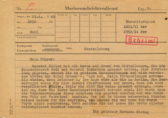 The message was sent to Hitler overnight on 23rd April 1945. In the transcript, typed up in German, Goering tells Hitler that if he does not hear anything from him that he will take over control of the German parliament and army. Goering was one of the leading Nazi party members.