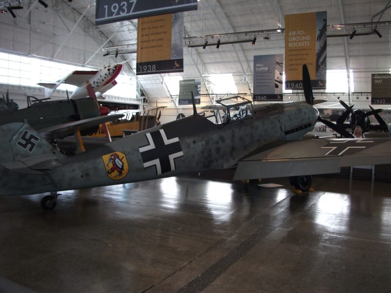 The fuselage of the Flying Heritage Collection’s German Messerschmitt Bf 109 fighter carries a mocking cartoon version of the UK’s Neville Chamberlain. The FHC’s aircraft actually fought in the Battle of Britain in the summer of 1940.