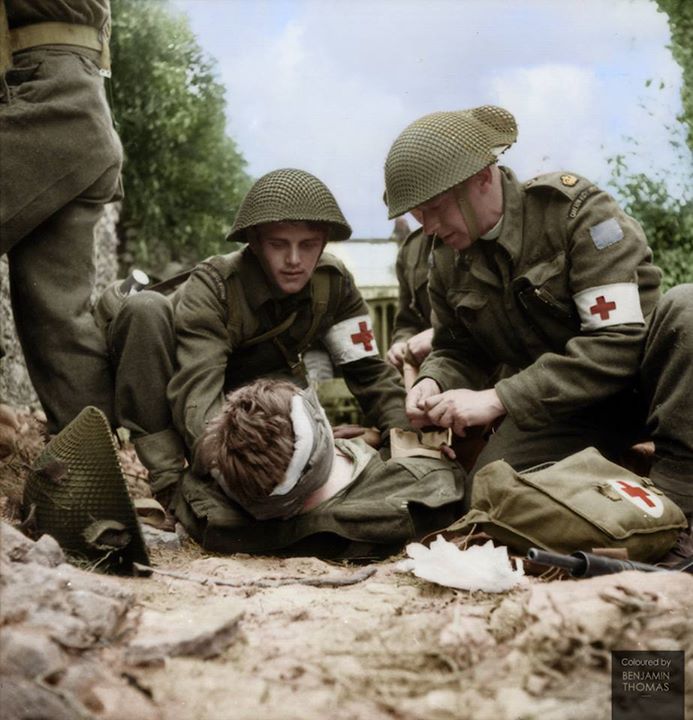 Major John W. Forth, Chaplain of The Cameron Highlanders of Ottawa (right), Canadian 3rd Infantry Division, helping the unit’s Regimental Aid Party treat a wounded comrade during the Battle of Caen, France, 15 July 1944.