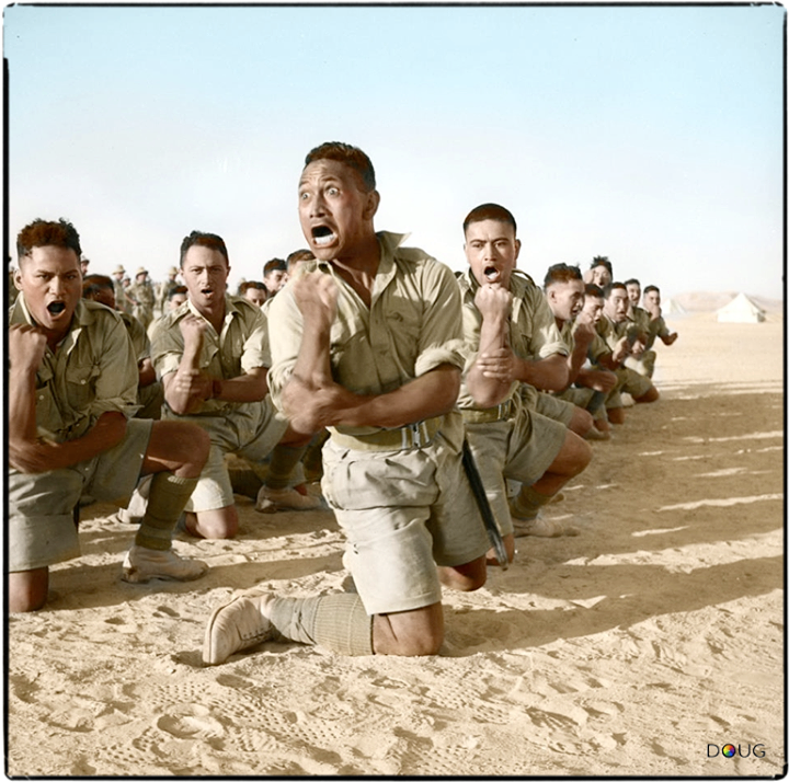 Māoris of ‘C’ Company, 28th Māori Battalion of the 2nd New Zealand Division perform the ‘Haka’ (ancestral war dance) for the visit of King George II of Greece, his wife the Queen, his cousin Prince Peter and Major General Freyberg.