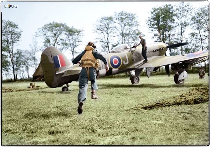 A pilot of No. 175 Squadron RAF scrambles to his waiting Hawker Typhoon Mark IB at B5 Airstrip Le Fresne-Camilly, Calvados, France following a call from the Group Control Centre ordering an air strike.