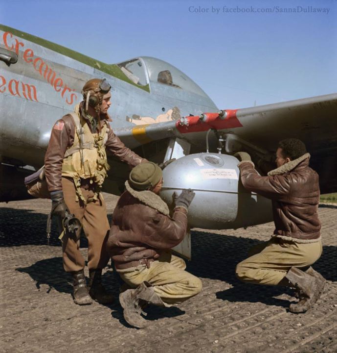“Tuskegee” airman Edward Creston Gleed from Lawrence, Kansas, Class 42-K, with two unidentified crewmen adjusting an external seventy-five gallon drop tank on the wing of a P-51/D Mustang, “Creamer’s Dream” (generally flown by 1st.Lt.Charles White) 301st FS, 332nd Fighter Group air base in Ramitelli, Italy, March 1945.