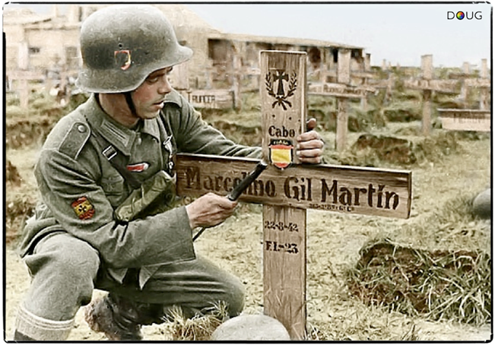 A comrade nails a division sleeve badge on the grave of Cpl. Marcelino Gil Martin of the 2nd Battalion, 263 Inf. Regt., 250th ‘Division Azul’ Wehrmacht Spanish Volunteers (Died 22/8/42) in Grigorovo, Near Novgorod in Russia.