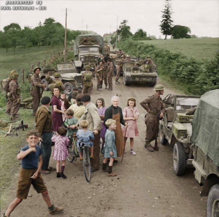 Local villagers come out to meet a British column of trucks, jeeps and carriers on a road near Flers, north-western France.