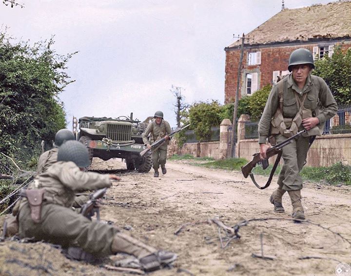 G.I.’s from (possibly) the 1st Btn, 314th Inf. Rgt. of the US 79th Inf. Div., during an attack on the Bolleville road, just north west of La Haye Du Puis in Normandy. c. 8th July 1944