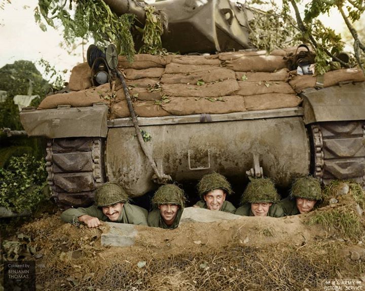 A US tank crew posing for the camera from a foxhole beneath their M-10 tank destroyer, north of Marigny, Normandy, 26 July 1944.