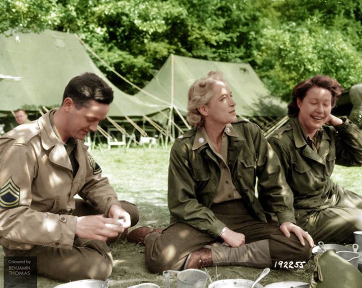 Lieutenant Colonel Anna “Tony” Walker Wilson, Women’s Army Corps (WAC) Staff Director in the European Theatre of Operations, sits in the shade of a tree with a fellow WAC and US Army Technical Sergeant, probably in the grounds of Château du Pont-Rilly, France, 1st of August 1944.