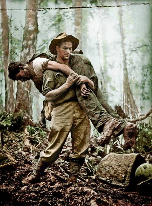 “1943-07-30. Mount Tambu, New Guinea. 2/5th Battalion stretcher bearer Corporal Leslie ‘Bull’ Allen MM, age 26, of Ballarat, Victoria, carrying to safety an American soldier who had been knocked unconscious by a mortar bomb. Allen carried out twelve American casualties while under fire on Mount Tambu. For this gallantry he received the United States Silver Star. He had won his Military Medal as a Private on 7 February 1943 at Crystal Creek, Wau.”