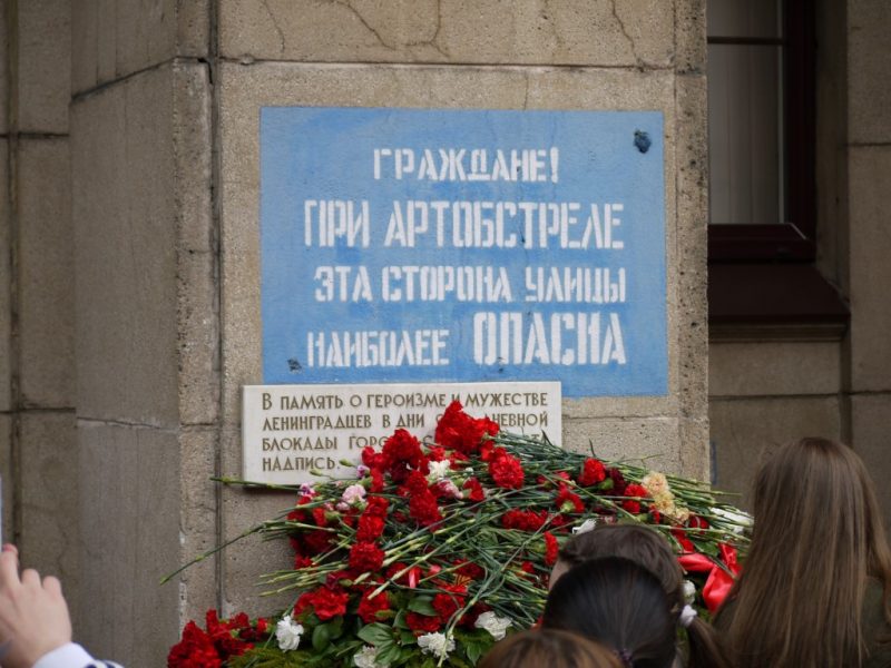 This sign is located near the western end of Nevsky Prospekt and reads “Citizens! During artillery bombardment this side of the street is especially dangerous”. The white plaque reads “In memory of the heroism and courage of the people of Leningrad during the 900-day siege of the city this inscription is preserved”. The blue paint is refreshed every year on May 9