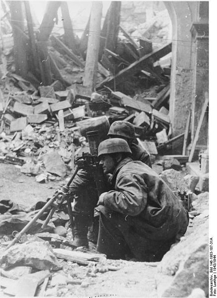 Taking advantage of the surrounding ruins, the German paratroopers were able to conceal artillery, machine gun emplacements and mortars that would take a heavy toll on enemy assaults. On the 15th of February, British troops advanced on Monte Cassino and suffered a decisive setback when met by stiff resistance from the Fallschirmjäger, with a company of the 1st Battalion Royal Sussex Regiment taking over 50% casualties. On the 16th of February the Royal Sussex Regiment moved forward to the assault with an entire regiment of men. Once again the British were met with a determined resistance from the Fallschirmjäger and driven back to their own lines.