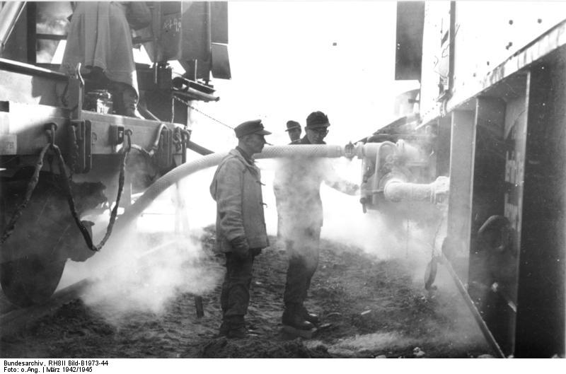Preparing a V2 for launch from a railway carriage. Note the supercooled fuel, all the pipes are covered in frost – March 1942