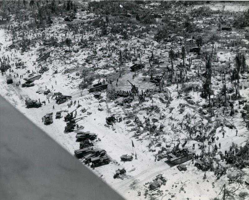 US Marines moving supplies ashore across the beachhead on Peleliu, Palau Islands, late Sep 1944. What appears to be water in the lower left is actually the wing of the photo plane.