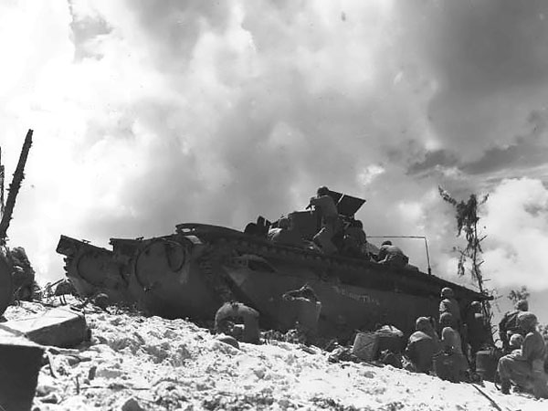 Using an Amtrac as shelter, American Marines fought on the beaches of Peleliu, Palau Islands, 15 Sep 1944