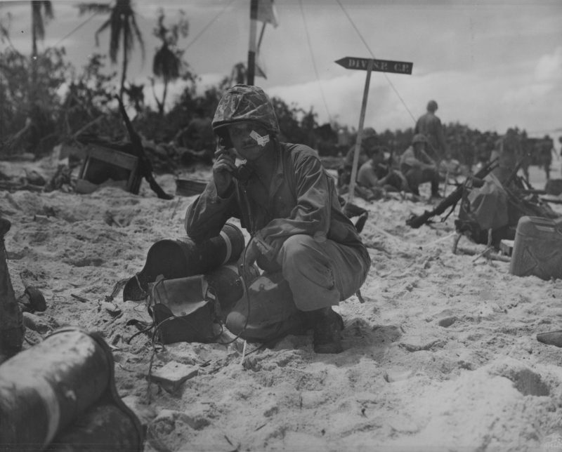 Lieutenant Colonel R. G. Balance of US 1st Marine Division at the shore party command post, Peleliu, Palau Islands, Sep 1944; note treated shrapnel wound on his left cheek
