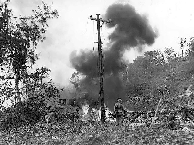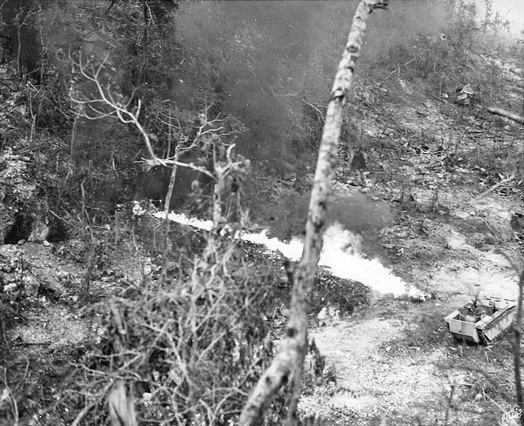 An American LVT equipped with flamethrower attacked a Japanese position at Peleliu, Sep 1944