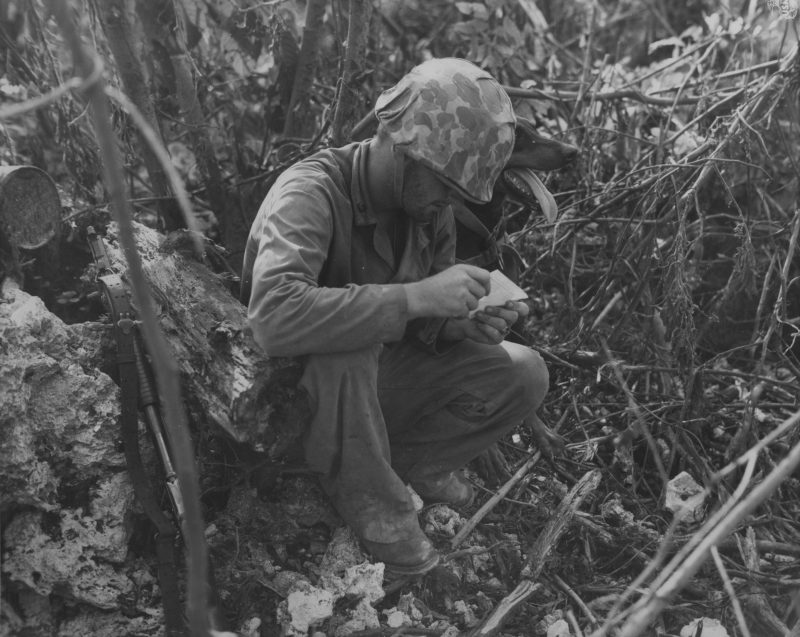 Two American Marines, Douglas Lightheart and Gerald Thursby, resting during Battle of Peleliu in the Palau Islands, 15 Sep 1944