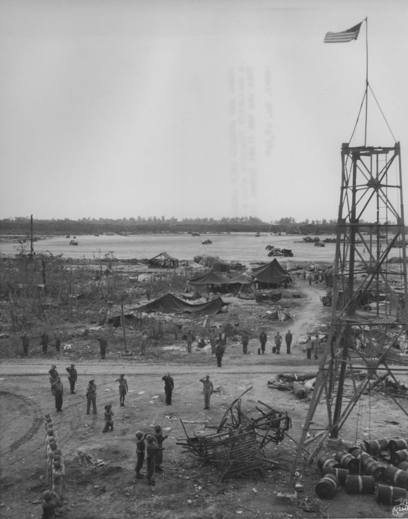 The first formal raising the American flag over Peleliu, Palau Islands, 27 Sep 1944; note Japanese observation tower
