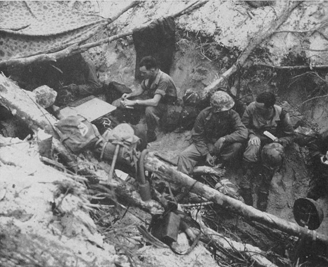 US 7th Marine Regiment’s command post inside a former Japanese anti-tank ditch, Peleliu, Palau Islands, 15 Sep 1944