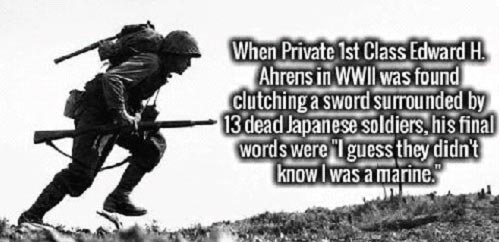 “I came across a foxhole occupied by Private First Class Ahrens, a small man of about 140 pounds… He was slumped in one corner of the foxhole covered with blood from head to foot. In the foxhole with him were two dead Japs, a lieutenant and a sergeant. There were eleven more dead Japs on the ground in front of his position. In his hands he clutched the dead officer’s sword.”