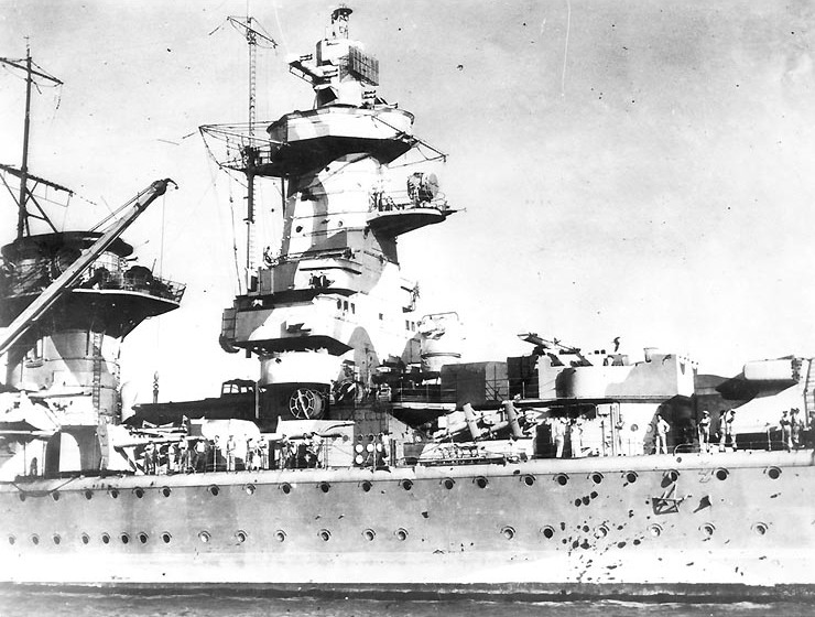 Admiral Graf Spee (German Armored Ship, 1936) View of the ship’s forward superstructure, starboard side, taken while she was off Montevideo, Uruguay in mid-December 1939, following the Battle of the River Plate. Note the shell fragment scars in her side plating, and the antenna of a “Seetakt” radar mounted on the face of her main battery gun director (top center).