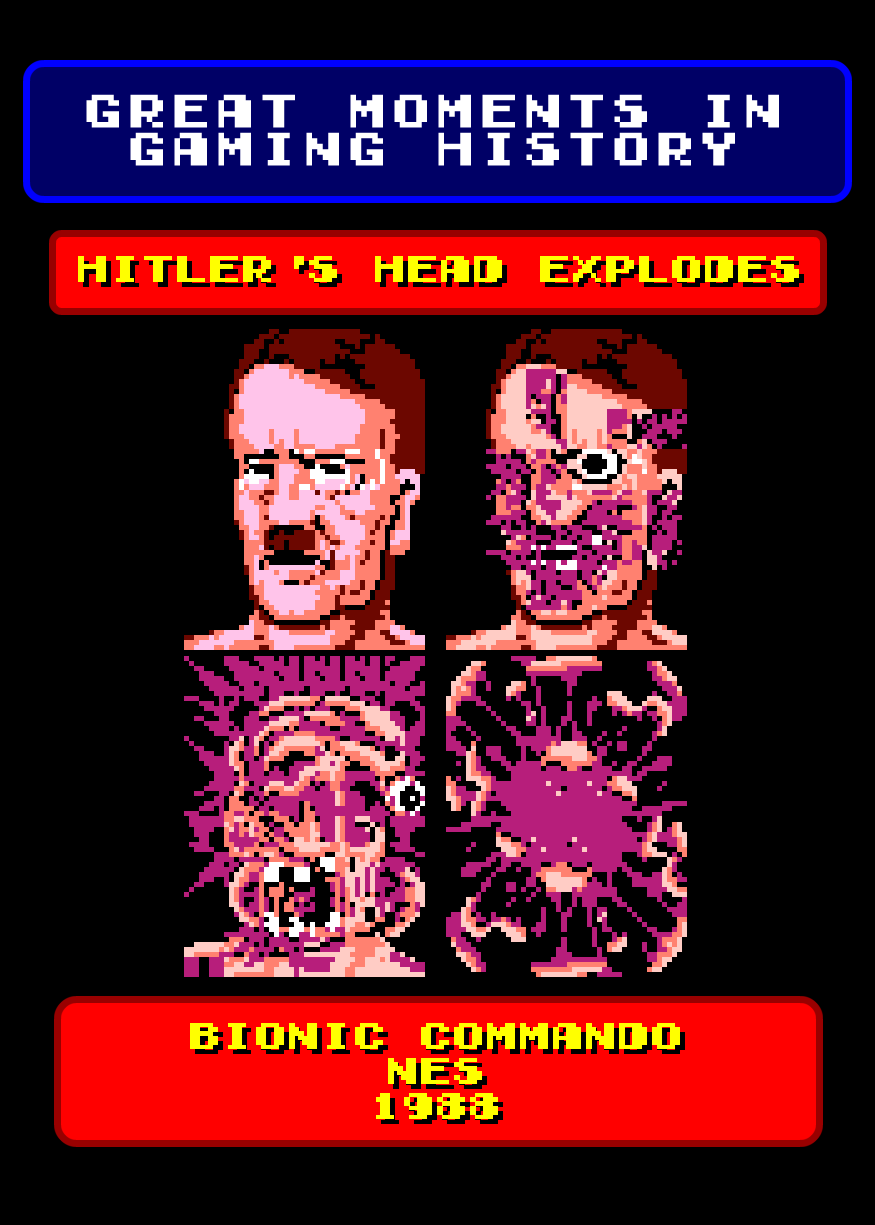 Bionic Commando Nintendo game has the army is trying to resurrect Adolf Hitler. Nathan “Rad” Spencer stops him escaping and gruesomely blows him up.