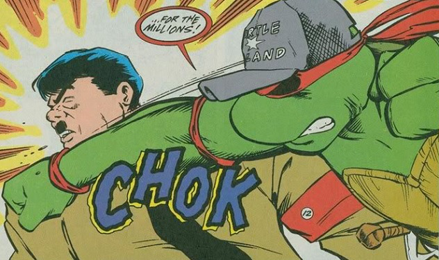 Teenage Mutant Ninja Turtles Adventures portrays Raphael punches Hitler back in time at the end of World War Two and the Ninja Turtles persuading him to shoot himself.