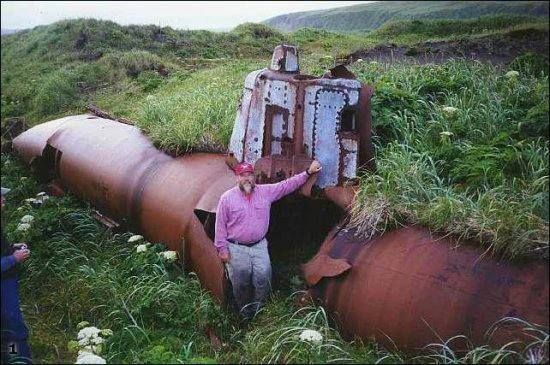 Members of the USA Fish and Wildlife Service from their research ship called “Tiglax” visited the Aleutian island of Kiska in June 2015 to investigate the rusting hulk of a Japanese midget submarine left lying in the grass of the island since the Second World War. During the war, the Japanese occupied some of the islands in the chain, including Kiska, where the USA had stationed some naval staff to monitor the weather station. The Japanese hoped to impede the movement of US forces across the northern Pacific Ocean.