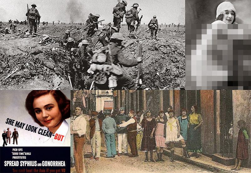 Photo story (Clockwise from top left): (1) Allied soldiers during WWI tried to utilize their next few mortal days (2) History of prostitution extends to all modern and ancient cultures (3) There were officially sanctioned brothels in France during WWI; A group of prostitutes in Marseilles, France in 1919 (4) Anti brothel and anti V.D. poster by U.S. government during WWII