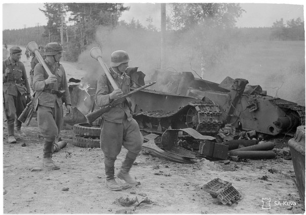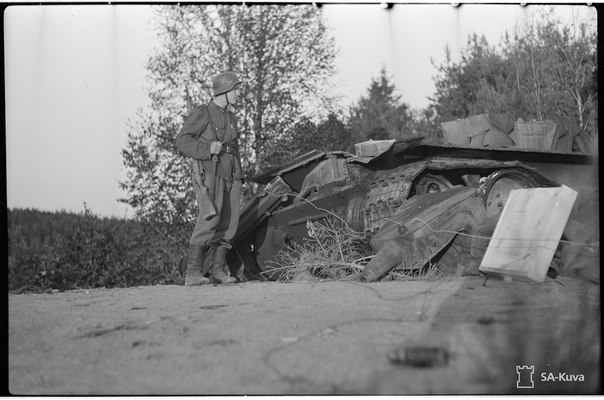 The tank was destroyed behind the Finnish defences and Finns arranged an impressive photo session around the tank, with Finnish infantry passing by the tank. They were all armed with new close-range anti-tanks weapons just arrived from Germany via Tallinn. The photos were widely used by Finnish propaganda to boost morale and became iconic images of the final battle between East and West on the Karelian Isthmus.