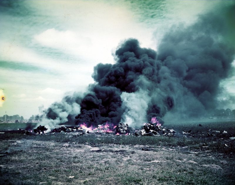 The burning remains of a crashed P-47 Thunderbold