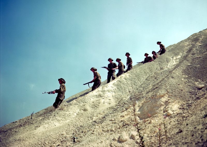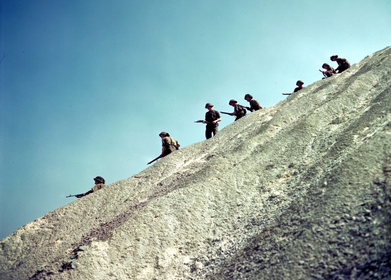 August 10th 1944, Canadian soldiers of the The Queen’s Own Cameron Highlanders of Canada, 6th Brigade, 2nd Canadian Inf. Div. descend descent a steep slope near Haut-Mesnil.
