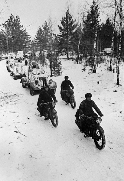 “A Soviet scouting unit”. The 1941-1945 Great Patriotic War against Nazi Germany. A Red Army scouting unit comprising motorcyclists and armored cars enroute to the front.