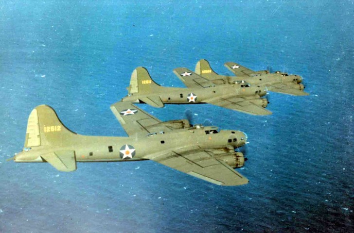 Color photograph of World War 2 in high definition. Three American strategic Boeing B-17E “Flying Fortress” heavy four-engine bombers in flight over the sea. [Via ]