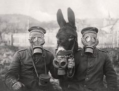 German soldiers with gas mask and their donkey. 1917 [Via]