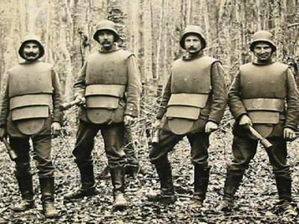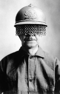 A mustachioed man wearing a steel helmet with built-on chain screen to protect soldiers’ eyes from fragments of shell, rock, etc. during World War I. Baltimore, Maryland, USA, 1918 [Via]