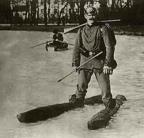 Hermann Peschel (right) lost his left arm and his right arm below the elbow in the First World War. The grip of his artificial arm was controlled by his left shoulder, 1920s [Via]