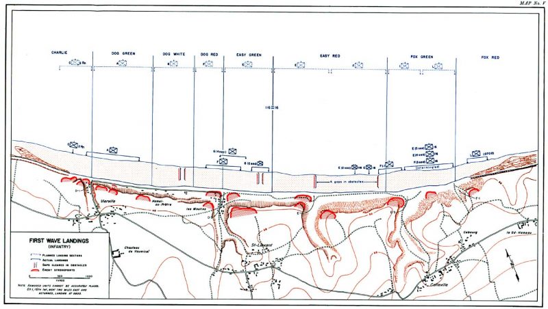 Of the nine companies landing in the first wave, only Company A of the 116th RCT at Dog Green and the Rangers to their right landed where intended. E/116, aiming for Easy Green, ended up scattered across the two beaches of the 16th RCT area.