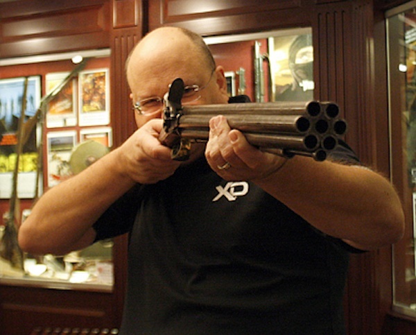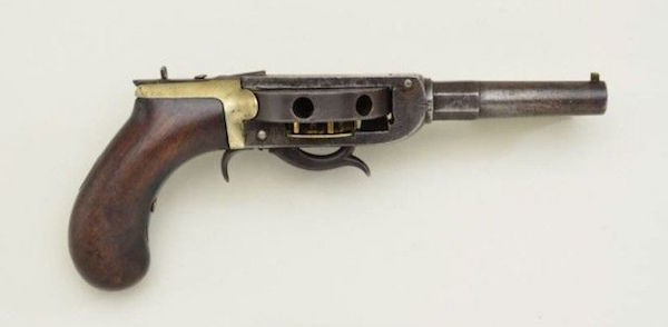 This revolver was produced in the early 1830’s. The cylinder rotated horizontally, which meant that as a round was fired, there was another pointed back toward the operator.