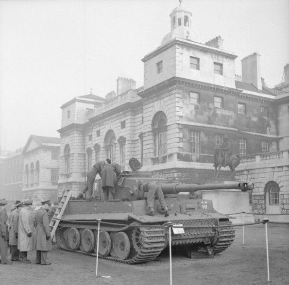 German Tiger I tank captured in Tunisia, on display at Horse Guards Parade in London, 18 November 1943. [Via]