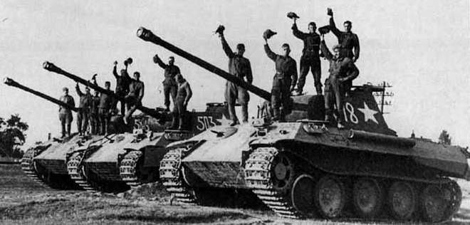 Captured Pz.V Panther (T-5) tank in 1945, now in use by the Russians [Via]