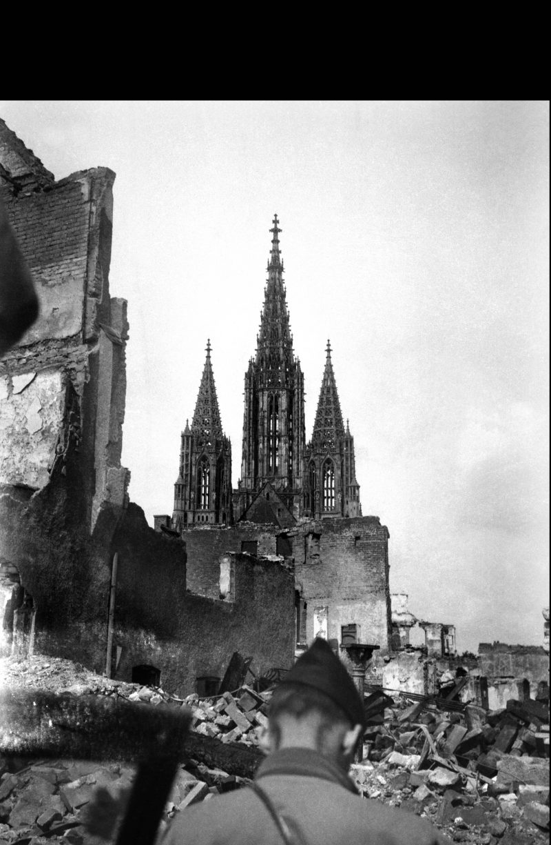 Here’s the view of Ulm from the top of the cathedral. You can see the main roads cleared by engineer bulldozers to make it easier to move around the city center. Most of the wooden roofs are burned away leaving hollowed out brick structures.